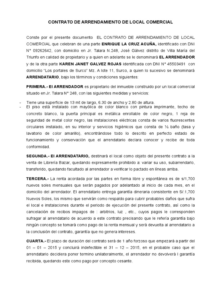 Contrato De Arrendamiento De Local Comercial Alquiler Pagos